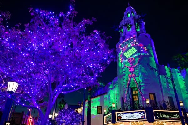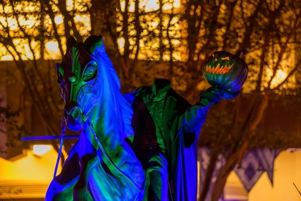 On Buena Vista Street in Disney California Adventure Park, Halloween motifs add to the ambiance, while the rider of an equine apparition, the Headless Horseman, appears to light each night’s darkening skies with his very own jack-o-lantern head!