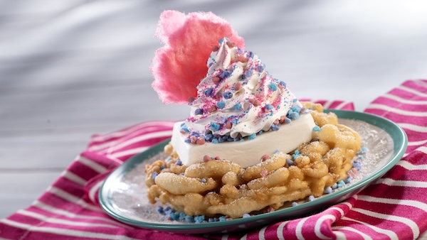 - Cotton Candy Funnel Cake topped with powdered sugar, vanilla ice cream, whipped cream, pink and purple sugar dusting, and cotton candy crunch (New)