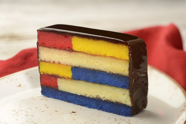 - Passion Fruit-filled Mango Cheesecake with coconut-pineapple cake, dragon fruit gelée, and dragon fruit-strawberry sauce